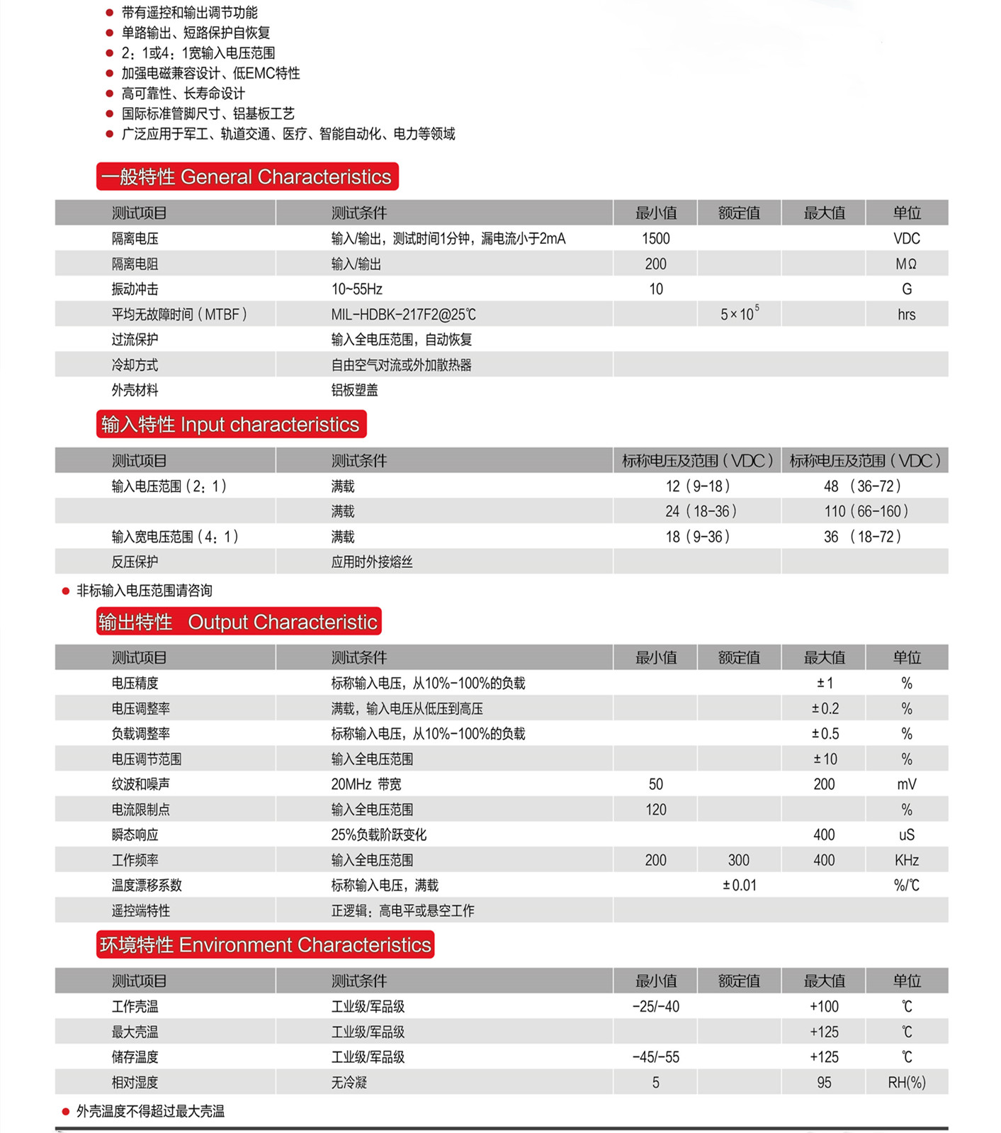 典型性能:寬壓輸入(1:2或1:4)、單路、雙路輸出,輸出低紋波噪聲、高穩(wěn)壓精度、長期短路保護自恢復(fù)、使用效率高,高隔離耐壓