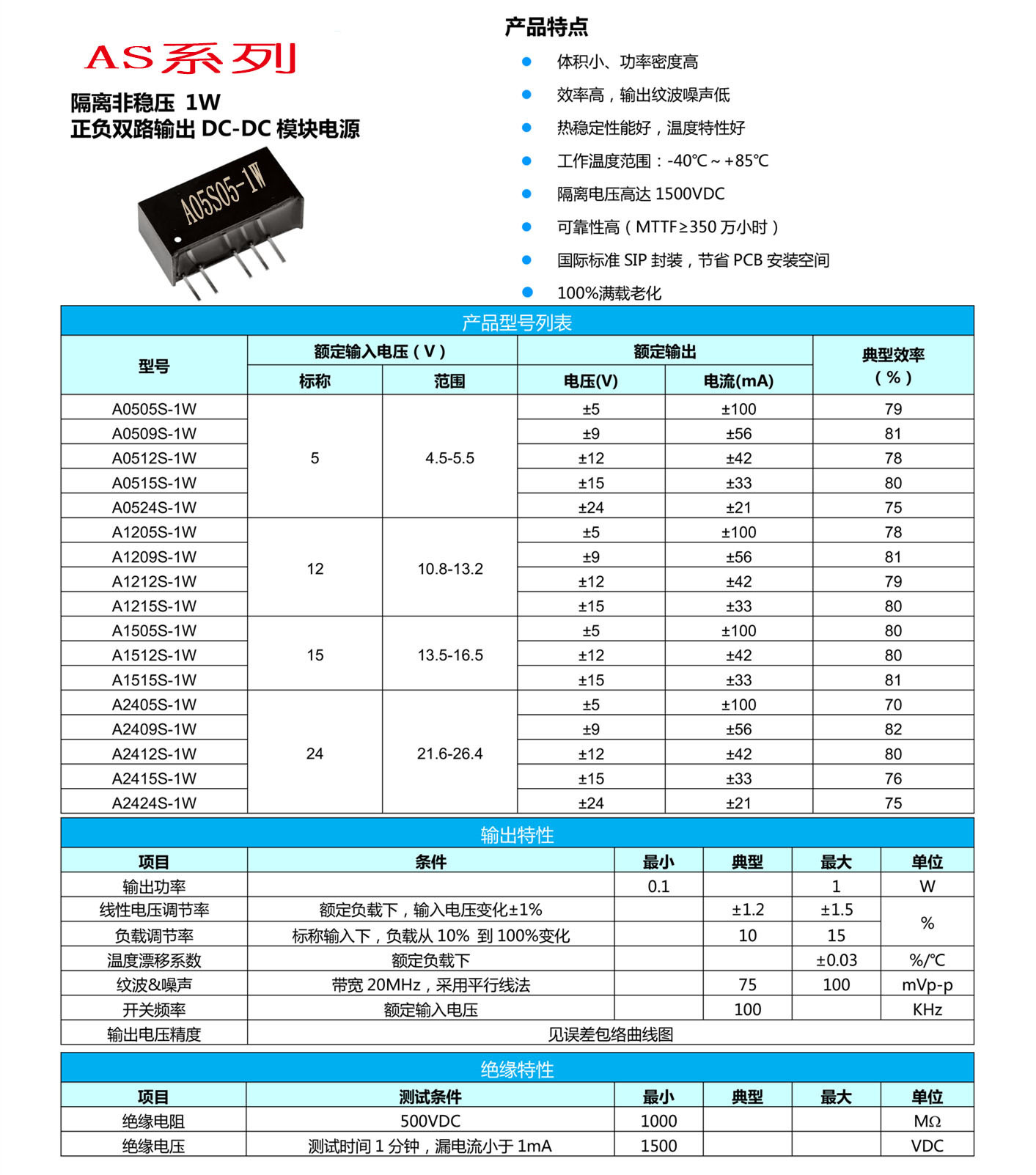 該系列產(chǎn)品采用標(biāo)準(zhǔn)SIP單列直插式,輸出功率:0.1W~3W單路、雙路輸出,輸出低紋波噪聲、高穩(wěn)壓精度、長(zhǎng)期短路保護(hù)自恢復(fù)、使用效率高,高隔離耐壓